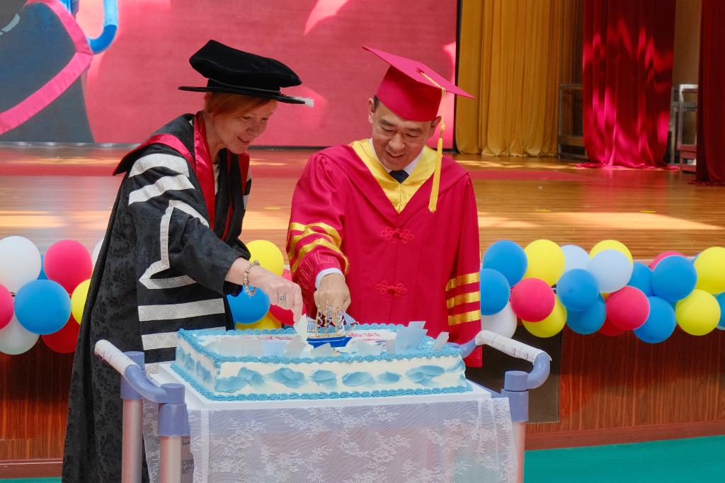 Pascale Quester、曾慶田互贈紀(jì)念品,并共同分切“揚帆起航 科啟未來”畢業(yè)主題蛋糕。