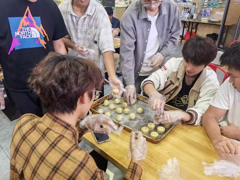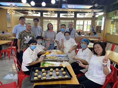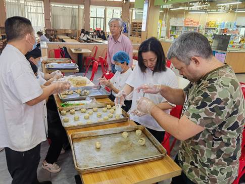 在活動的現(xiàn)場,經過食堂專業(yè)師傅的細心指導,餐廳員工與外教、學生親切交流,傳授制作月餅的方法與技巧,在知道自己包下的月餅會發(fā)放到每一個同學的手中,大家更是干勁十足。