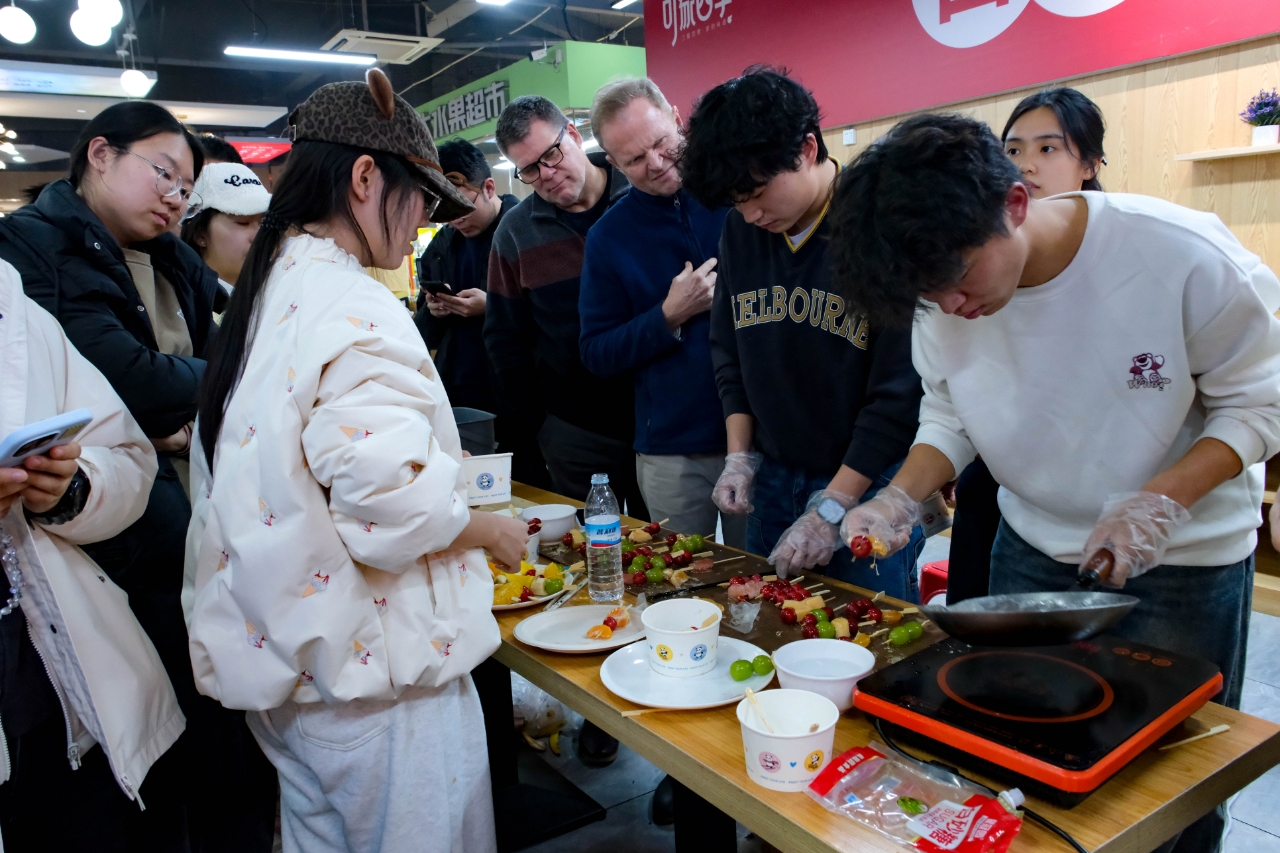 活動(dòng)伊始,中英雙語(yǔ)主持的開(kāi)場(chǎng)致辭生動(dòng)傳遞了“推動(dòng)中外文明交流互鑒”的核心主旨,為現(xiàn)場(chǎng)營(yíng)造出熱烈融洽的氛圍。在糖葫蘆制作環(huán)節(jié),同學(xué)們嚴(yán)格遵循傳統(tǒng)工藝,依次完成鮮果甄選、清洗串制、糖漿熬制等工序,并耐心協(xié)助外方教師體驗(yàn)“火候把控”“糖絲拉制”等關(guān)鍵步驟。師生們共同協(xié)作,最終制作出晶瑩剔透的糖葫蘆,品嘗后紛紛稱贊其“色香味俱佳”,既展現(xiàn)了中華飲食的視覺(jué)美感,又蘊(yùn)含豐富的味覺(jué)層次,充分彰顯了傳統(tǒng)文化的獨(dú)特魅力。