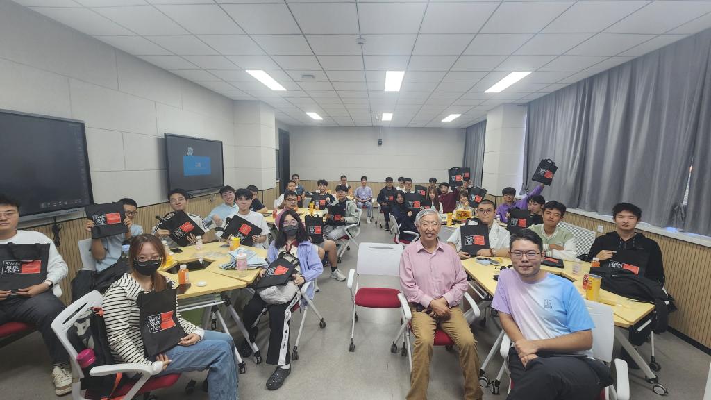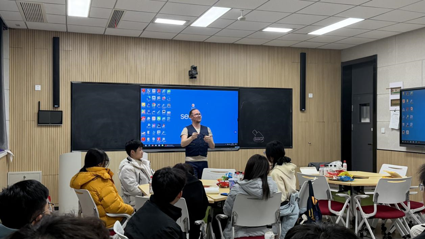 在互動(dòng)環(huán)節(jié),Cliff先生將他的人生哲學(xué)凝練為兩點(diǎn)真摯贈(zèng)言:“對(duì)自己熱愛(ài)的事物,請(qǐng)永遠(yuǎn)保持不熄的激情;對(duì)遇見(jiàn)的同行者,請(qǐng)永遠(yuǎn)懷抱結(jié)交的真誠(chéng)。” 他更別出心裁地設(shè)置“傾聽(tīng)年輕聲音”的環(huán)節(jié),主動(dòng)邀請(qǐng)?jiān)趫?chǎng)學(xué)生為他提供人生建議。一位同學(xué)的“行動(dòng)是理想的最高表達(dá),其價(jià)值遠(yuǎn)勝于空談的努力”引發(fā)了全場(chǎng)共鳴,Cliff先生對(duì)此深表贊同,并送上精心準(zhǔn)備的小禮物以表感謝。隨后,他與同學(xué)們圍坐暢談,在輕松愉快的氛圍中,繼續(xù)交換著關(guān)于學(xué)業(yè)、職業(yè)與人生的真知灼見(jiàn)。