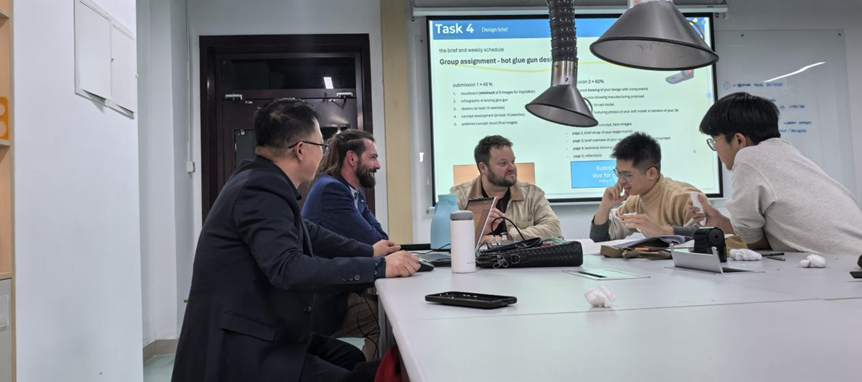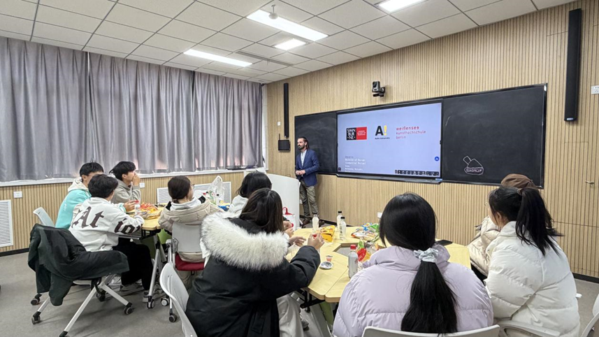 Andrew在課上和共課老師一起為學(xué)生分析產(chǎn)品設(shè)計(jì)問(wèn)題