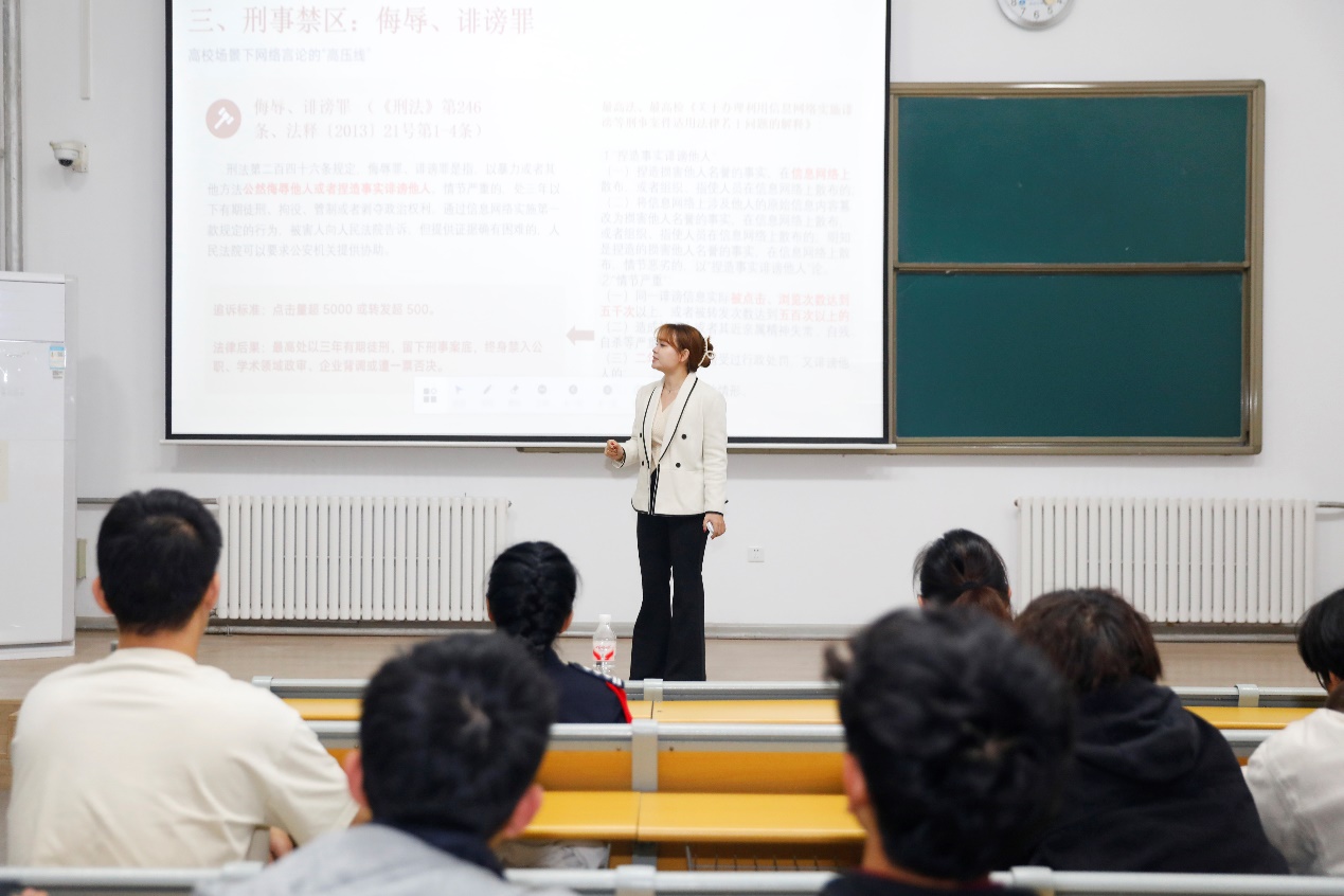 山東睿揚(yáng)律師事務(wù)所劉雯綺律師從專業(yè)法律視角,聚焦“法律成本”核心議題,圍繞“網(wǎng)絡(luò)言論邊界分析、典型違法案例拆解、理性發(fā)聲及合法維權(quán)”展開(kāi)解讀。她結(jié)合《網(wǎng)絡(luò)安全法》、《禁毒法》等相關(guān)法律法規(guī),通過(guò)典型案例分析,清晰闡釋了網(wǎng)絡(luò)暴力、侵權(quán)、參與網(wǎng)絡(luò)詐騙、校園霸凌、涉毒等行為的民事責(zé)任、行政責(zé)任乃至刑事責(zé)任,讓學(xué)生深刻認(rèn)識(shí)到“一時(shí)沖動(dòng)”背后的沉重法律代價(jià)。針對(duì)大學(xué)生常見(jiàn)的兼職維權(quán)、個(gè)人信息保護(hù)等問(wèn)題,劉律師還提供了實(shí)用的法律維權(quán)指引,鼓勵(lì)學(xué)生學(xué)會(huì)用法律武器保護(hù)自身合法權(quán)益。