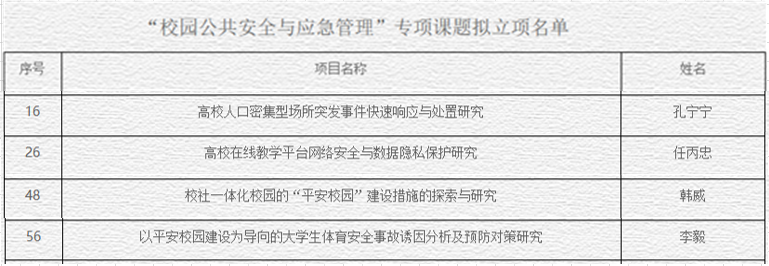 近日,校區(qū)孔寧寧、任丙忠、韓威、李毅申報(bào)的課題獲批學(xué)?!靶@安全與應(yīng)急管理” 專項(xiàng)課題立項(xiàng)。